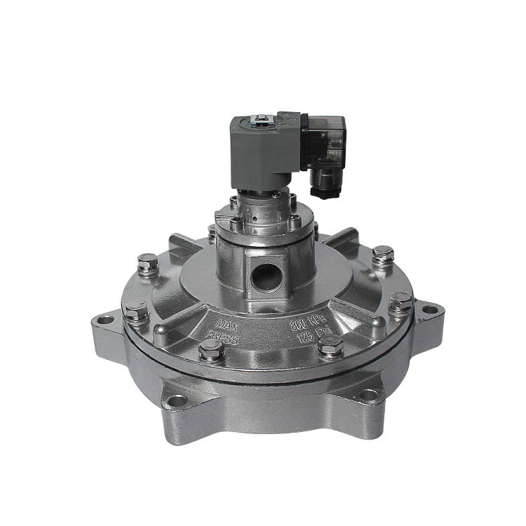 Bere ezaugarria da angelu zuzeneko balbularen airearen sarrera eta irteera hodiak 90°-ko angeluan daudela. Balbula-gorputza eta boneta aluminiozko aleaziozko materiala erabiliz fundituta daude. Gainazaleko tratamenduaren ondoren, korrosioarekiko erresistentzia bikaina erakusten dute. Diafragma eta zigilatzeko junta bulkanizatu baten bidez ekoizten dira. Pilotu-buru elektromagnetikorako lehengaiak eraginkortasun handiko material magnetikoz eta altzairu herdoilgaitzezko blindaje magnetikoz osatuta daude. Osagai kritikoak malgukiak eta lokailuak bezalako osagaiak altzairu herdoilgaitzez eginak dira. Konexio-metodoa: aire-banatzailea (aire depositua) hodia eta hauts-biltzailearen sopletea balbularen sarreran eta irteeran, hurrenez hurren, sartzen dira, bi muturretan konpresio azkoinekin itxita.